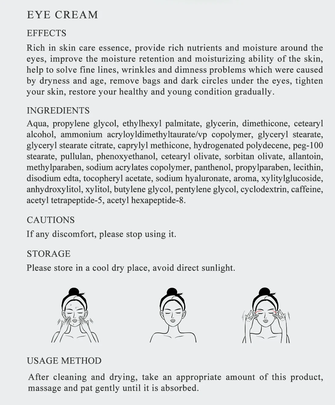 1.After cleansing and toning, apply the eye-sized eye cream to the eye area with the ring finger